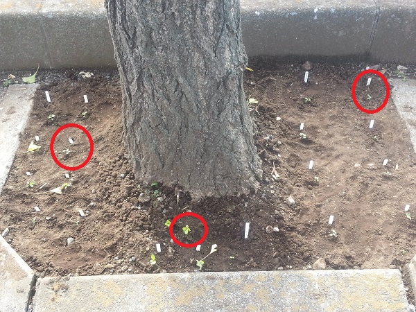 白い棒は雑草と間違えて抜かないための目印です。